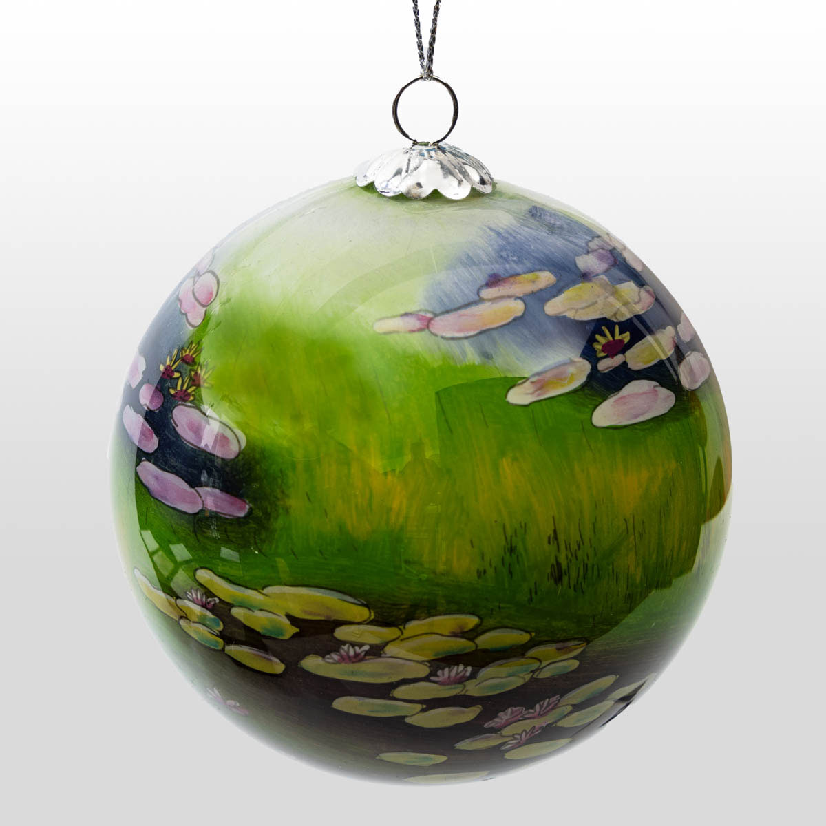 Glass Christmas bauble Claude Monet : "Nympheas day" A Christmas ornament made of glass, inspired by the work of Claude Monet, hand-painted inside the bauble with a fine brush. A gift idea for lovers of Impressionism. Diameter: 8 cm Sold in its black presentation box.