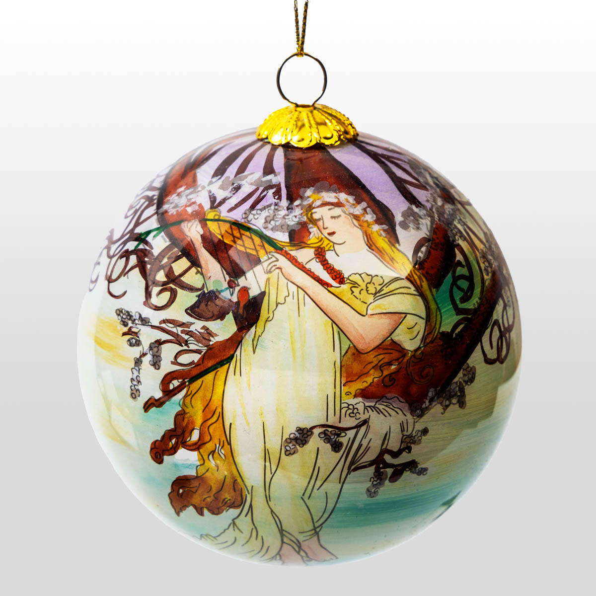 Glass Christmas bauble Alphonse Mucha : "Spring" A Christmas ornament made of glass, inspired by the work of Alphonse Mucha, hand-painted inside the bauble with a fine brush. A gift idea for lovers of Art Nouveau. Diameter: 8 cm Sold in its black presentation box.