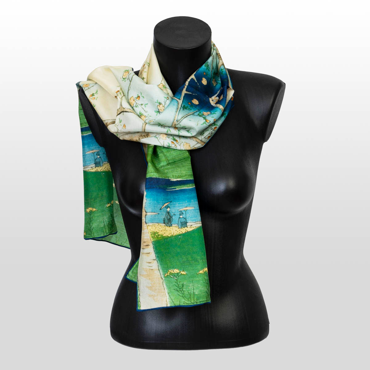 A soft and elegant scarf, inspired by traditional Japanese patterns and colors in the Ukiyo-e style. A unique accessory to combine comfort and refinement.