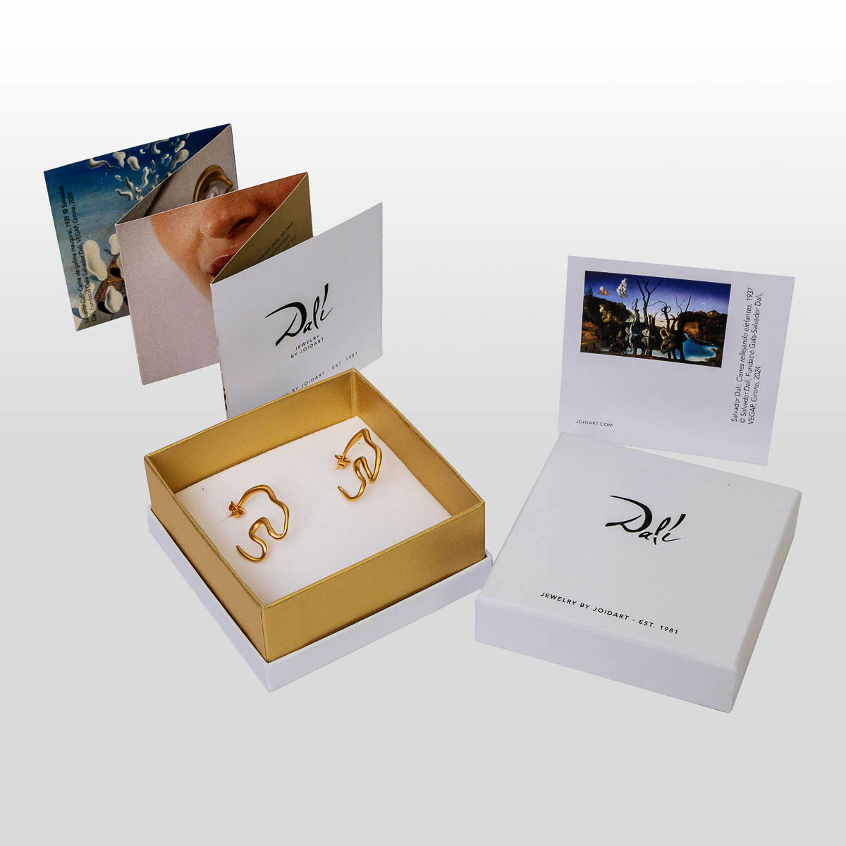 Presentati in un elegante cofanetto con il logo di Dalí, accompagnati da un libretto illustrato che ripercorre l'universo dell'artista, questi orecchini incarnano un gioiello leggero decisamente artistico.